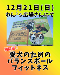 - 12/21(日)「愛犬のためのバランスボールフィットネス」埼玉県秩父市@わん’s広場みなさんこんにちは✨わんこのお手当てラボです😊📣開催告知です📣 12/21(日)埼玉県秩父市にある「わん’s広場さん」にて「愛犬のためのバランスボールフィットネス」を初開催いたします! 大好評のバランスボール… 続きを読む »12/21(日)「愛犬のためのバランスボールフィットネス」埼玉県秩父市@わん’s広場