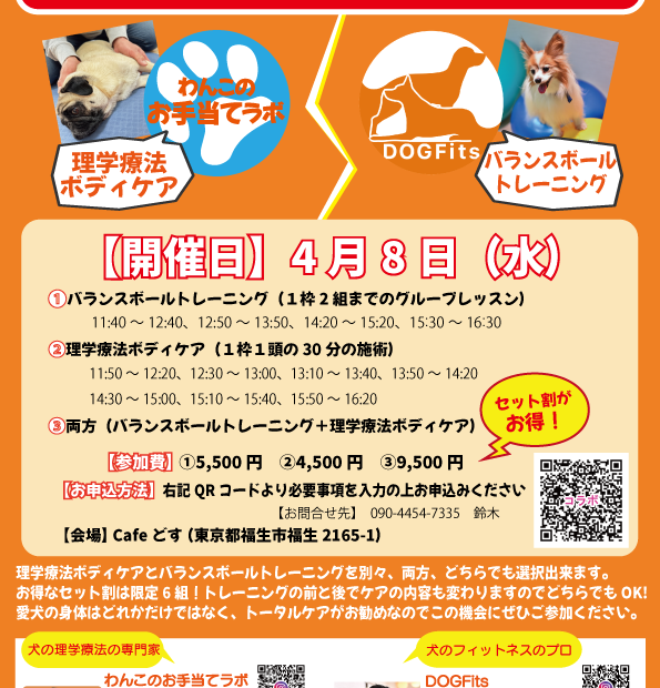 皆さま、こんにちは。 わんこのお手当てラボです😊 春の柔らかな日差しが心地よく、愛犬とのお散歩も楽しい季節になりましたね。 おかげさまで毎回「満員御礼」をいただいております、大好評の「DOG Fits」さんとのコラボイベ… 続きを読む »【4/8開催】愛犬の「2歩先の未来」を作る、バランスボール×ボディケア コラボイベント 東京都福生市@Caféどす