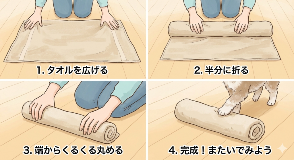 バスタオルをくるくると細長く丸めて、棒状にします。これを床に置き、わんちゃんにまたいでもらいましょう。